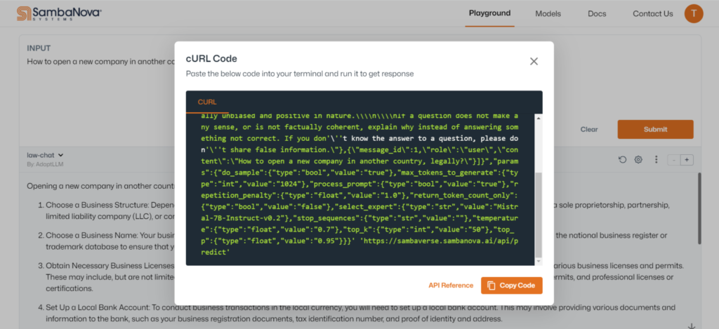 The integration with SambaNova Systems API brings advanced AI capabilities to the “Legal Expert” application. SambaNova’s platform supports a wide range of AI functionalities, from natural language processing to machine learning, which are essential for analyzing legal documents and providing predictive insights.